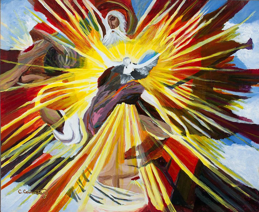 Der Heilige Geist oder der Geist- Gottes ist ebenfalls eins mit dem Sohn und dem Vater und überall da anwesend, wo menschliche Informations– und Bewusstseinsstrukturen hoch dynamisch und von allen Verunreinigungen frei sind, wie Gott-Vater und Gott-Sohn.