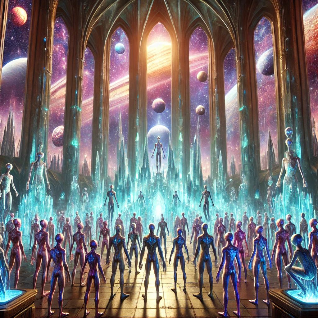Die Große Lumenkathedrale, eine Kirche aus lebendigem Kristall, stand im Zentrum jeder Siedlung. Ihre gewölbten Decken und Wände bestanden aus reflektierenden Materialien, die das Sternenlicht einfingen und es in tausend Farben brachen. Dort sammelten sich die Lumenari, um die Botschaften des Himmels zu „hören“. Es war kein Hören im menschlichen Sinne, sondern ein inneres Verstehen – das Flüstern der Sterne vibrierte in ihren leuchtenden Körpern und formte Visionen und Gedanken.