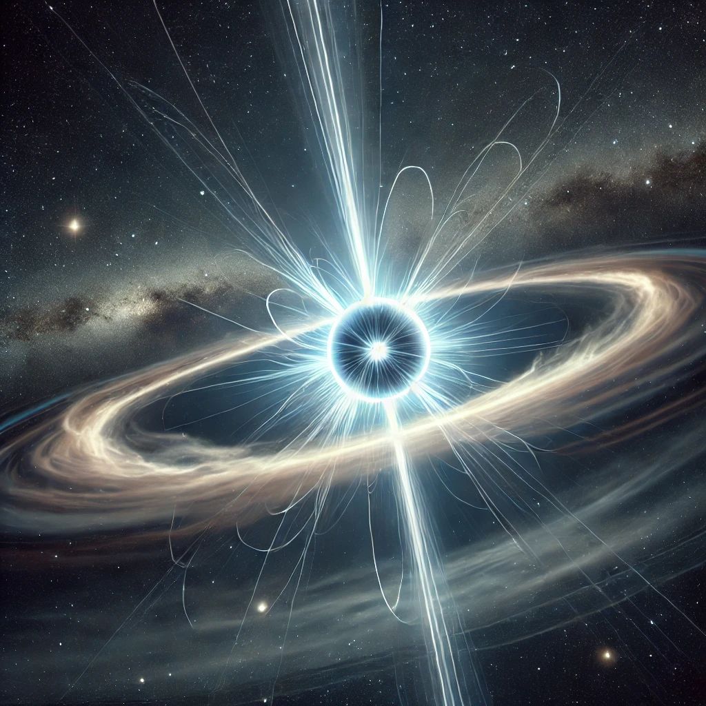 3. Rasante Drehung: Nach seiner Entstehung dreht sich der Neutronenstern rasend schnell – oft hundert Mal pro Sekunde oder noch schneller. Aus seinen Polen schießen dabei Lichtstrahlen ins All. Wenn diese Strahlen zur Erde zeigen, sehen wir regelmäßige „Blinksignale“ – einen sogenannten Pulsar.