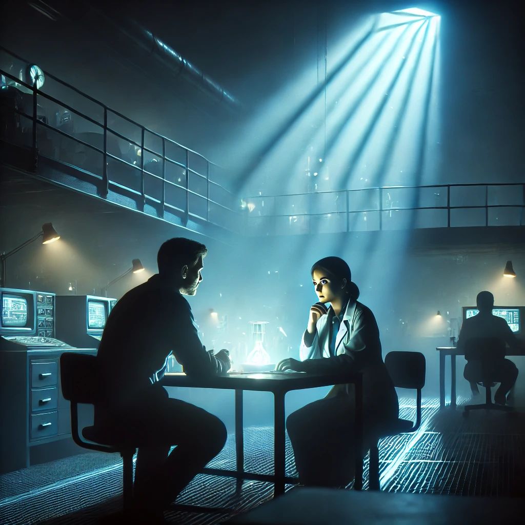 Unter dem flackernden Licht des Labors, das wie ein stetiger Puls das nächtliche Schweigen durchbrach, saßen Elena und Tarek bei einer Tasse Kaffee, umgeben von einer Atmosphäre, die mit jedem geteilten Wort dichter und geheimnisvoller wurde.